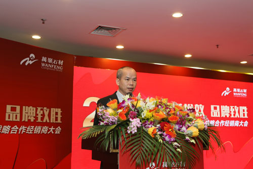 由万峰石材科技有限公司总裁林志伟先生和江南营销中心郑学龙先生共同为新品发布揭幕。本次年会共推出了包括岗石和无机环保合成石的15款产品,产品种类繁多,花色丰富,纹理逼真,吸引了现场嘉宾的目光。